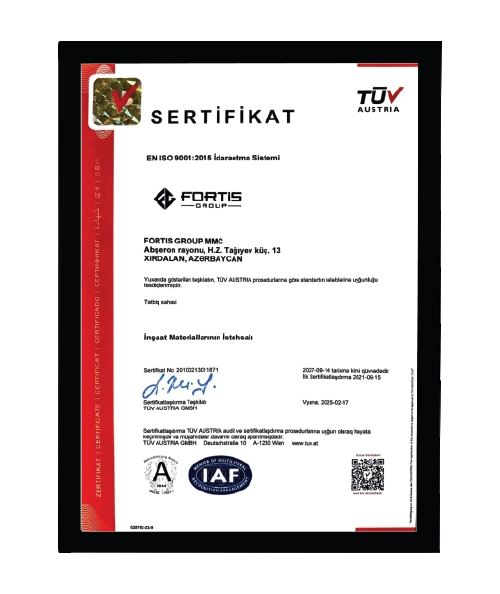 Azərbaycanın inşaat materialları istehsalı sektorunda qabaqcıl şirkətlərdən biri olan “FORTİS GROUP” MMC 2004-cü ildən fəaliyyət göstərir və fəaliyyətini təkcə Azərbaycanda deyil həmçinin yaxın region ölkələrindədə uğurla həyata keçirir. Şirkət öz fəaliyyətində innovativ istehsal texnologiyaları ilə yüksək keyfi yyətli məhsullar istehsal etməyi hədəf alıb. Şirkət öz istehsalını gips əsaslı məhsullar, sement məhsulları, kafel və metlax yapışdırıcıları, aralıq doldurucuları, hidroizolyasiya məhsulları, hazır təmir qarışıqları, boya məhsulları,xammal məhsulları, zəmin-döşəmə məhsulları, fasad məhsulları, astarlar olmaqla 11 istehsal qrupunda cəmləşdirib.
